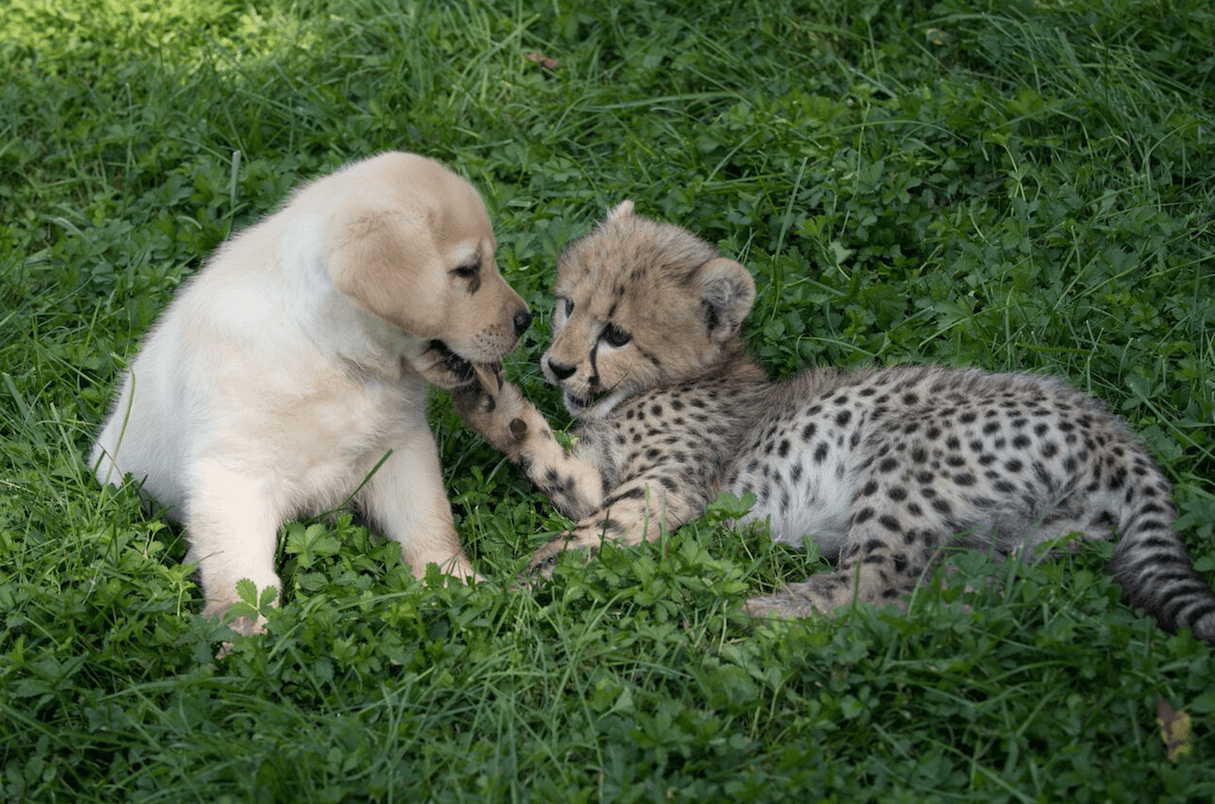 Many say that friends can influence and shape our appearance. In this case, it is true. The adorable puppy transfers positive energy to the shy cheetah pup, helping his friend get out of his territory. Humans and animals cannot deny their innate cuteness!