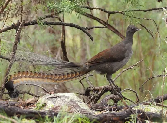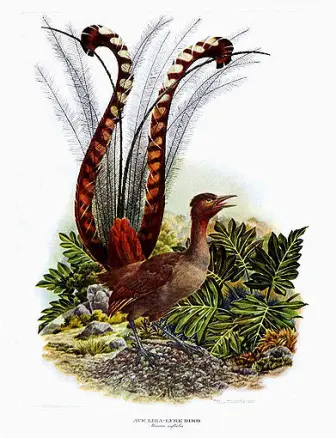 The lyrebird was given that name because of its striking tail. When specimens were sent to the British Museum in the 1800s, the taxidermists had never seen one before and decided to arrange the feathers in a display similar to that of a peacock. Something like this: